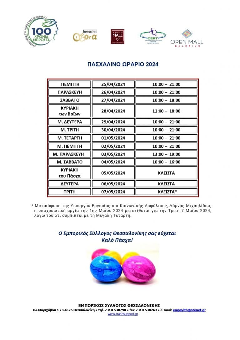 ΑΝΑΚΟΙΝΩΣΗ ΕΜΠΟΡΙΚΟΥ ΣΥΛΛΟΓΟΥ ΘΕΣΣΑΛΟΝΙΚΗΣ ΓΙΑ ΤΗΝ ΕΡΓΑΤΙΚΗ ΠΡΩΤΟΜΑΓΙΑ Ο Εμπορικός Σύλλογος Θεσσαλονίκης ενημερώνει εμπόρους και καταναλωτές ότι κανονικά θα λειτουργήσουν